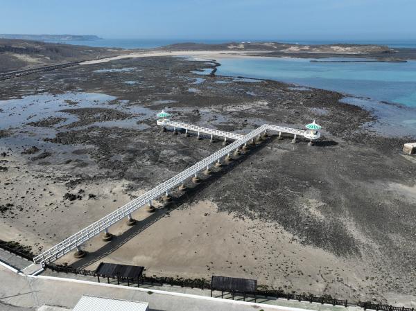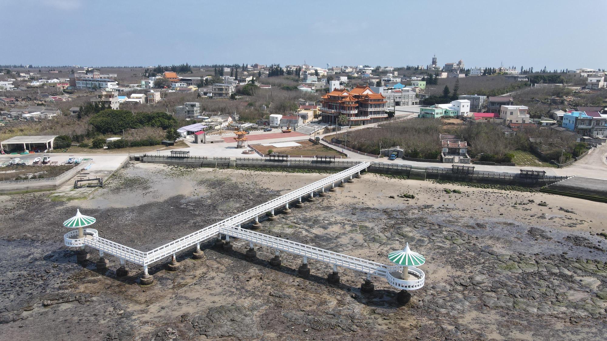 ,展臂入海,純白的橋身筆直地延伸至遠方,左右兩側各建立綠色的涼亭。雙曲橋正好位在