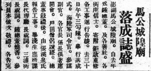 昭和8年夏城隍廟完工,舉行落成典禮。海陸軍司令官、參謀副官、澎湖廳各官長、三浦街長俱出席與會,並由張溪泉代表廟方報告工事之梗概。