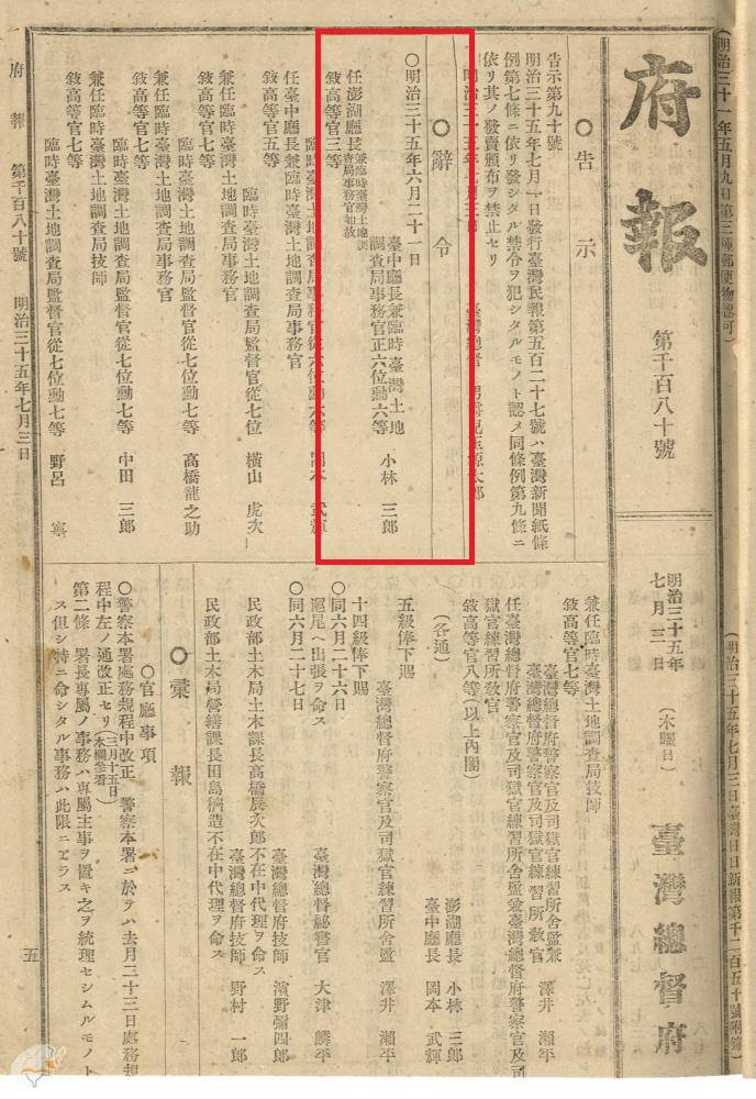 小林三郎,其任職澎湖廳長期間是在