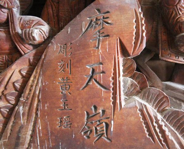 ,正面屋簷下的吊籃(中心鏤空而內鑿一鷹)、蓮花吊筒和挑出的鳳栱及振翅奮發的鷹,殿內大門上方的水族斗座、佛龕上方的大楣(「郭子儀拜壽」)等都是黃玉瑤的精心之作。後來