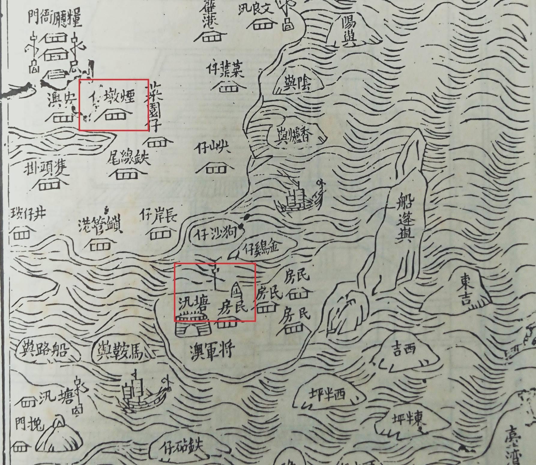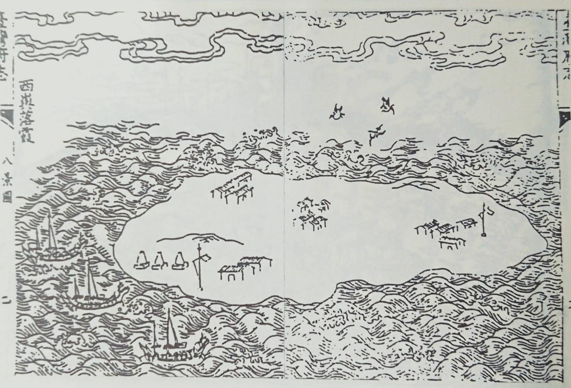 1897年日人的社寺調查分別為「池王廟」與「昭德宮」。第三,所謂「島上有聚落、有叢祠廟宇,廟埕均插有旗座,南北各一」的說法,此圖所描繪的屋宇並非廟宇叢祠,只是聚落而已。旗座、旗杆與旗幟是清代台灣澎湖各地輿圖常見官方行政或軍事機構所在地,並非廟宇的設施。第四,所描繪「類如石塔三座應為澎湖的石敢當信仰」也值得進一步討論。