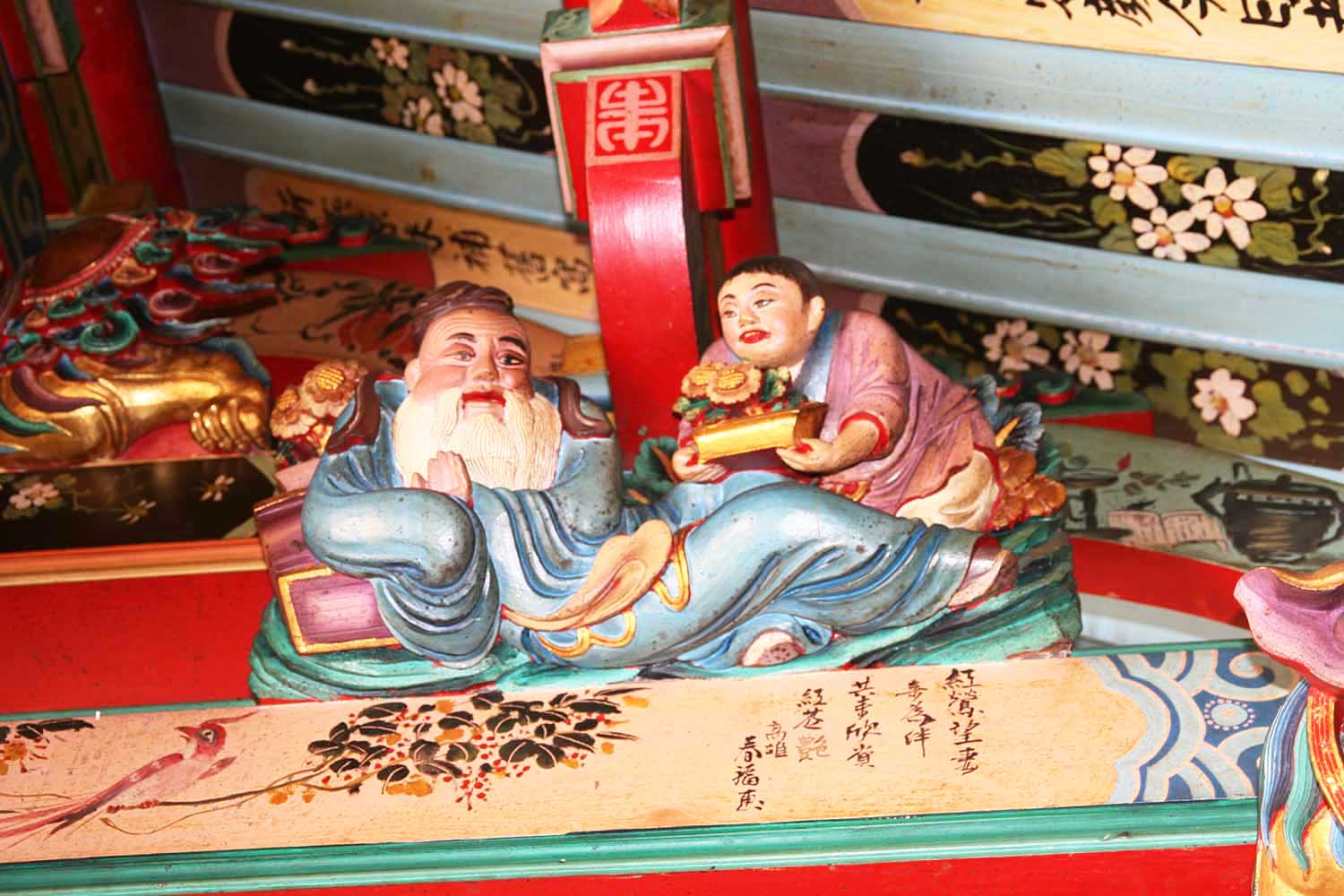」古匾,廟頂七彩剪黏龍騰鳳舞,廟堂酒仚童子斗拱鑿花近在眼前,廳前以