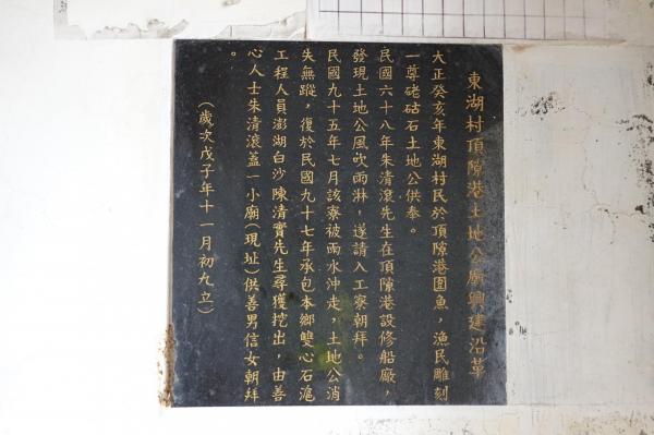 ,朱清滾先生在頂港設修船廠,發現土地公風吹雨淋,遂請入工竂朝拜。