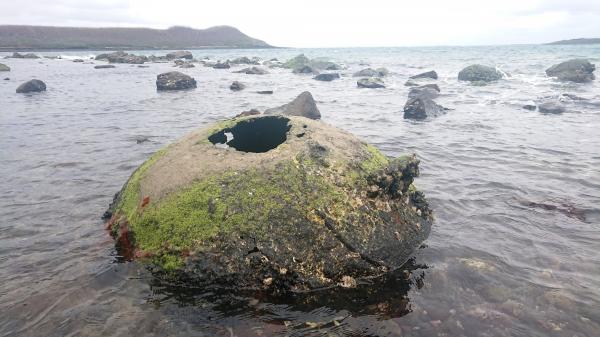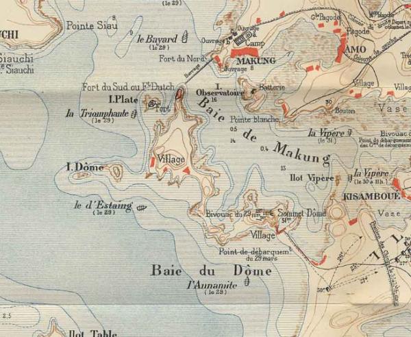 鐵索橫江─金龜頭與蛇頭山之間的鐵鍊 - 1883年12月法軍進攻駐紮在越南北圻的清軍,清法戰爭於焉爆發,1884年8月法軍轉而攻打基隆。澎湖海防亦形勢嚴峻,澎湖士紳郭鶚翔、蔡玉成、黃濟時等奉令舉辦民團。此時,清軍在澎湖陸地上共有三條防線,第一道防線是從雞母塢到豬母水,就是今天的山水海灘這個地方。第二道防線,是雙頭掛到烏崁。第三道防線是石泉到拱北山。然而,這三道防線在1885年3月29日至31日三天內,很快就被法軍擊潰。 - E. Garnot 所著的《法軍侵台始末》此書中,法軍除了對澎湖各砲台的武器配置瞭若指掌外,法軍亦真查得知Fort du Nord (北砲臺─金龜頭砲臺)與Fort du Sud Ft Dutch(南砲臺─蛇頭山砲臺)之間有鐵鍊封鎖媽宮港。法軍已其優勢的船艦順利推進戰事,並占領紗帽山一帶。3月29日入夜後,孤拔派遣Foret海軍中校和Goudot海軍上尉從事偵察媽宮港的鐵鍊。偵察的結果證明封鎖的柵閘僅是由兩條粗大的鐵鍊造成,這些鐵鍊每隔若干距離便有浮標支持著。隔天清晨,這些鐵練被Talpomba少校指揮的Triomphante艦的小艇鎖破壞,Bayard艦順利立即駛入了馬公港,並對清軍的散兵壕從事背面攻擊。 - 此條鐵鍊(barrage)也清楚的描繪在Les Pescadores (Mouillages intérieurs & Ile Ponghou.)地圖上。《孤拔元帥的小水手》一書中對此條鐵鍊是如此的形容:「障礙物是由一條浮標拉成三公尺長的粗鐵鍊,剛開始我們以為線端會有魚雷。然而只在航道上放了一半,剩下的地方就放一條看起來像用繩股作成的纜繩,我順手把他收了起來。」 - 從以上的描述,法軍幾乎沒有遭遇什麼抵抗就順利的清除媽宮港的障礙物。鐵鍊也在此戰役中被破壞了。1895年澎湖乙未之役,清軍是否如清法戰爭般於媽宮港以鐵索橫江方式阻絕日軍進入媽宮港,不得而知。然而,明治38年日俄戰爭期間,澎湖廳長小林三郎於4月14日發布《廳報》告示第14號:媽宮港左側區域禁止夜間捕魚。其範圍以虎井西山至西嶼屹仔尾為基準線,往外延伸二海里;其次,虎井西山至西嶼屹仔尾、虎井西山沿桶盤嶼至雞籠嶼以及雞籠嶼至小頭角 (東鼻頭)所構成的區域。 - 1949年5月20日零時起,宣告全臺灣省戒嚴,除基隆、高雄、馬公三港口在本部監護之下,仍予開放,並規定省內海上交通航線外,其餘各港,一律封鎖,嚴禁出入。金龜頭與蛇頭山之間,也有一條大鐵練。 - 媽宮港自明清以來,一直是兵家必爭之地。百年來歷經變遷,此條鐵鍊於清法戰爭中破壞。二次戰後重建,於今已經廢棄,然其殘蹟依然留存於金龜頭與蛇頭山兩地。 - #感謝蔡興達先生提供座標 - 作者|許玉河老師 知識建檔|2019-02-11。知識更新|2025-01-30 修正回報,請來信|me@penghu.info